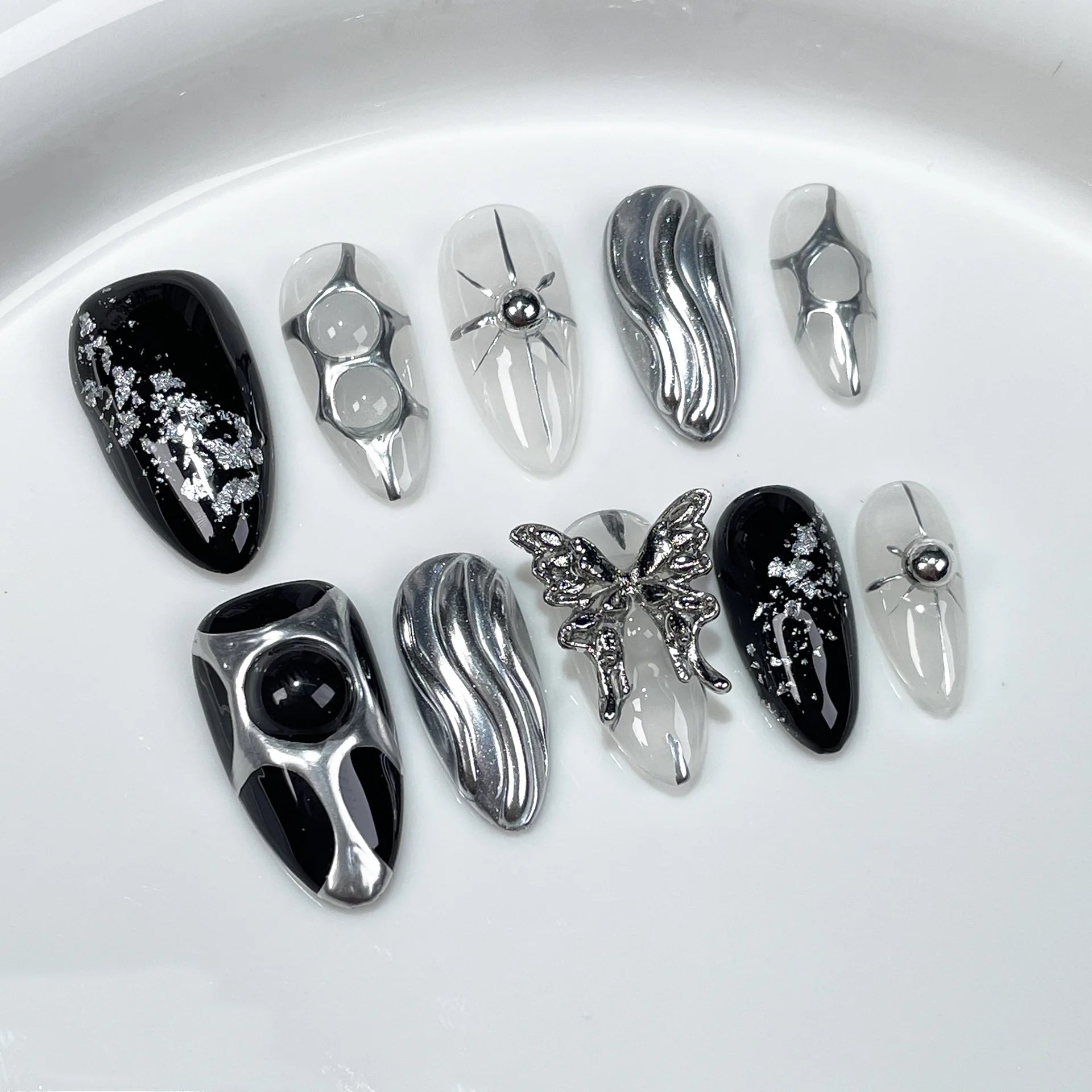 10Pcs Black Almond Handmade Press on Nails Butterfly Fake Nails Wearable Stick-on Nails Rose False Nail Uñas Postizas Uñas 네일팁