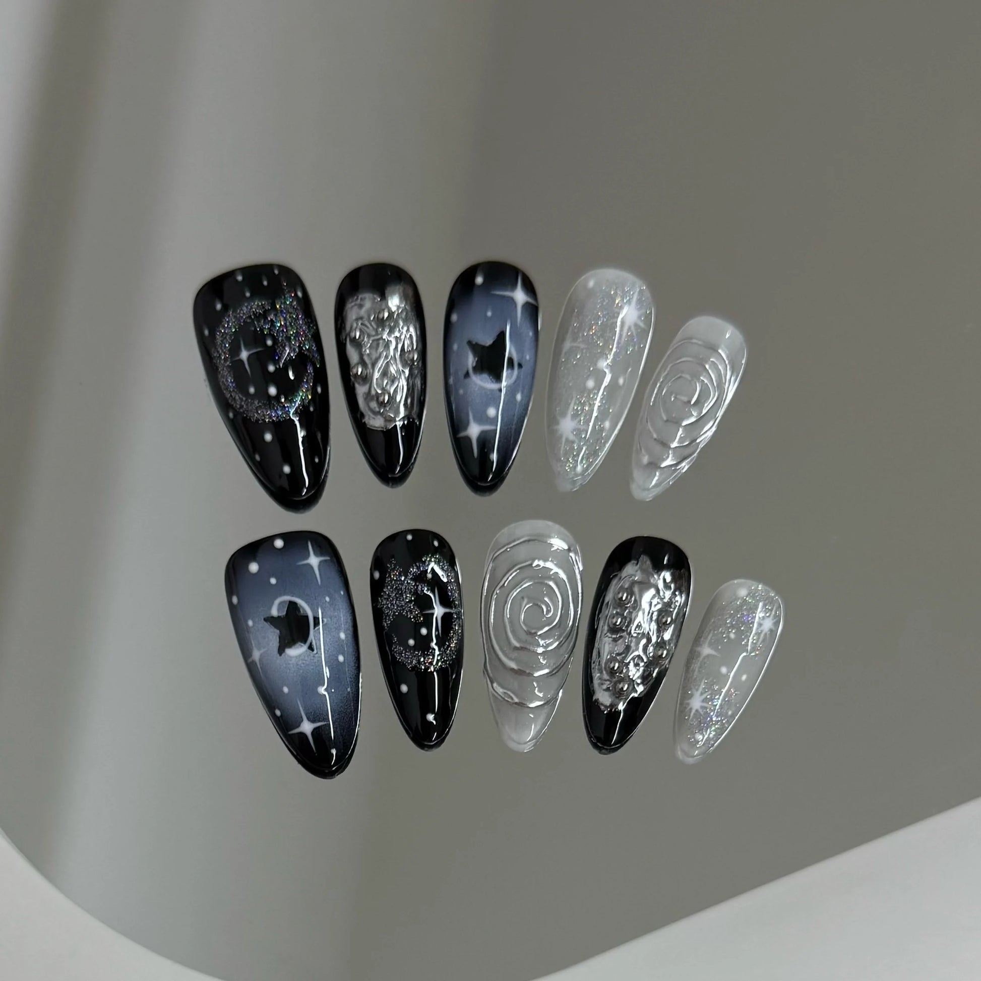 10pcs Handmade Press on Nails Y2k Starry Night Sky Almond Fake Nail Tips Detachable Wearable Sweet Cool False Nails for Girls
