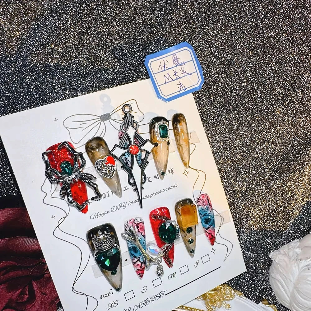 10Pcs High Quality Handmade Press on Nails Suppressing Demons Color Collision Heavy Industry Golden 3D Cross Luxurious Dark Real