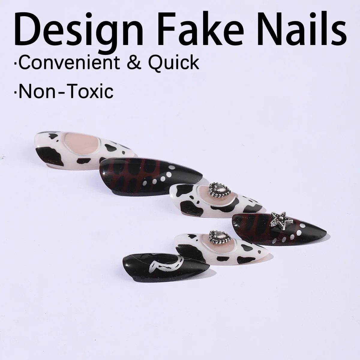 24pcs Gothic Punk Press on Nails Black White Cow Print Baroque Fake Nails for Women Girls Wearable French Almond False Nails