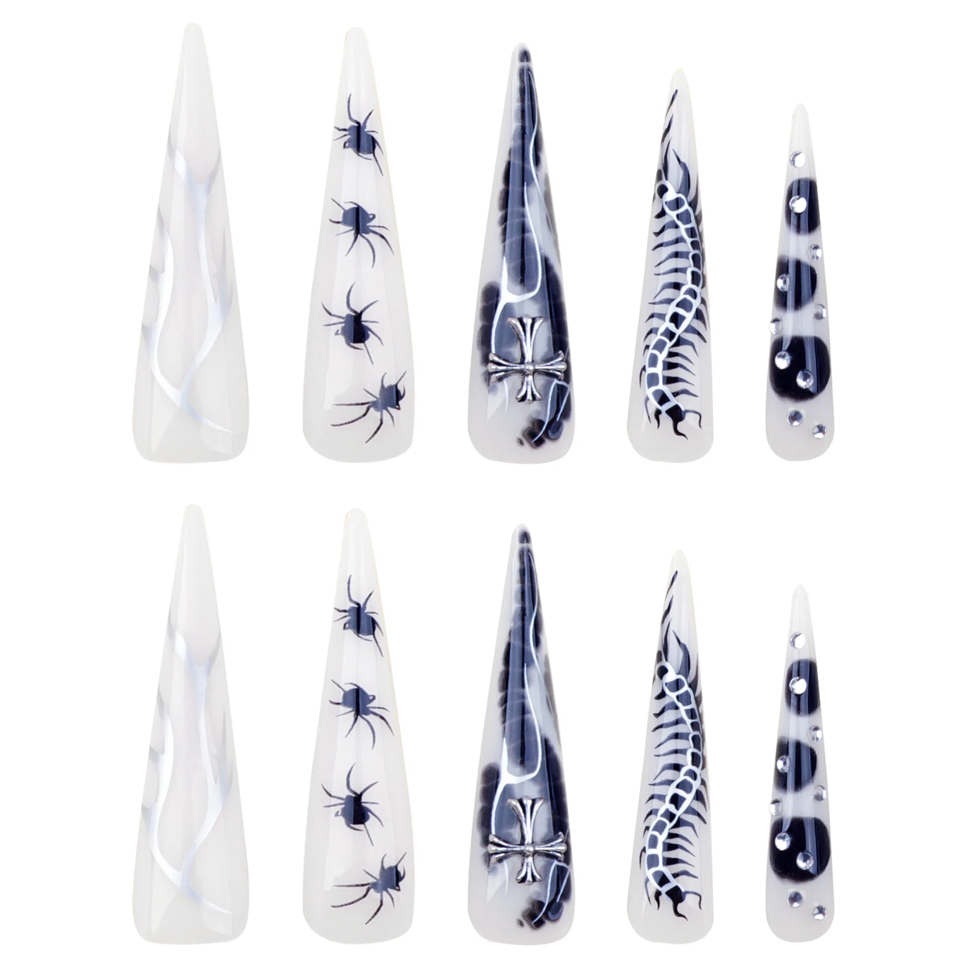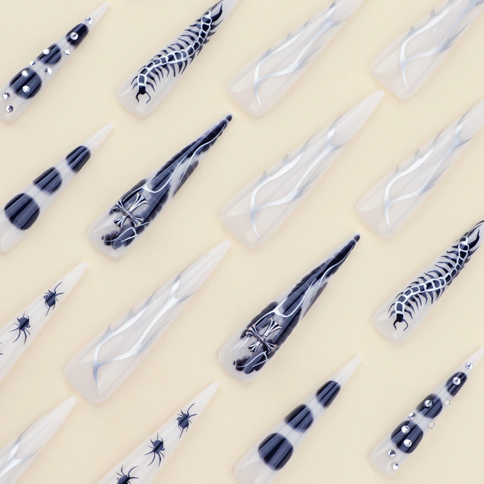 24pcs Spicy Girl Press on Nails Y2k Sliver Flame Black Spider Long Pointed False Nails European Crocodile Pattern Fake Nail Tips