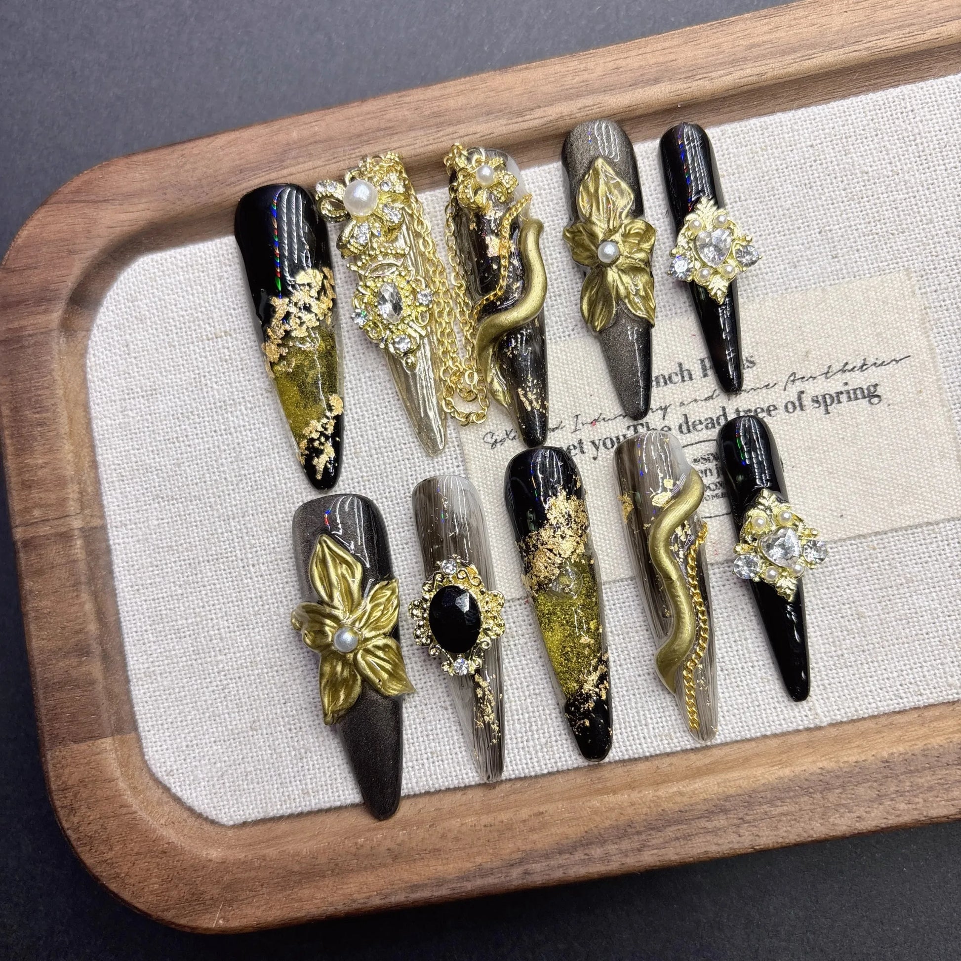 Gothic Queen Armor Nails Black Silver Gold Leaf Resin Flexible Fit Snake Chain Gothic Glam Crystal Durable Party Nail Ar